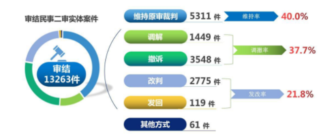 法庭审结的13,263件民事二审实体案件中,以维持原审裁判方式结案5,311件,占40.0%;以撤诉方式结案3,548件,占26.8%;以调解方式结案1,449件,占10.9%;以发回重审方式结案119件,占0.9%;以改判方式结案2,775件,占20.9%;以其他方式结案61件,占0.5%。
