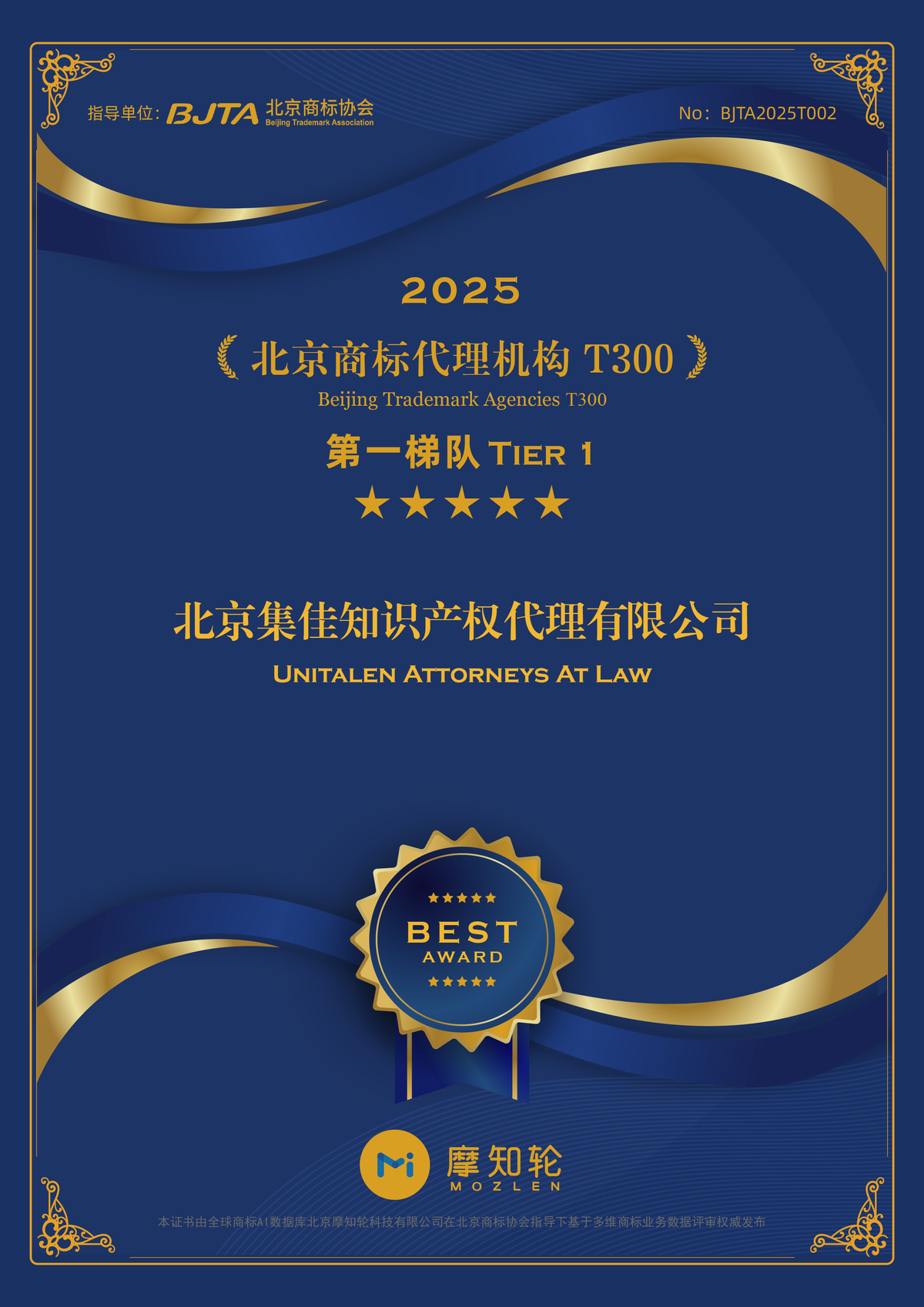 | Unitalen Ranked in Tier 1 of the "Beijing Trademark Agencies T300 for 2025" List with Honor |