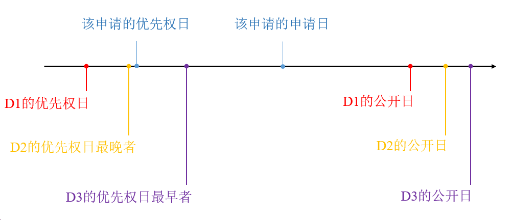 更具体而言,审查意见指出:D2的优先权日早于本申请优先权日(相关日期的比较参见下面的图1),公开日晚于本申请优先权日,且公开了一个与本申请权利要求1的结构极为接近的化合物,区别仅在于是否被氘代,申请人在修改时可以考虑对比文件2的相关技术方案;D3的优先权日晚于本申请优先权日但早于本申请的申请日,其公开了一个落入本申请权利要求1范围内的化合物,鉴于本申请优先权文件外文且非英文,审查员核实优先权存在障碍,申请人在针对本通知书进行修改时可以酌情考虑D3公开的相关技术方案。
